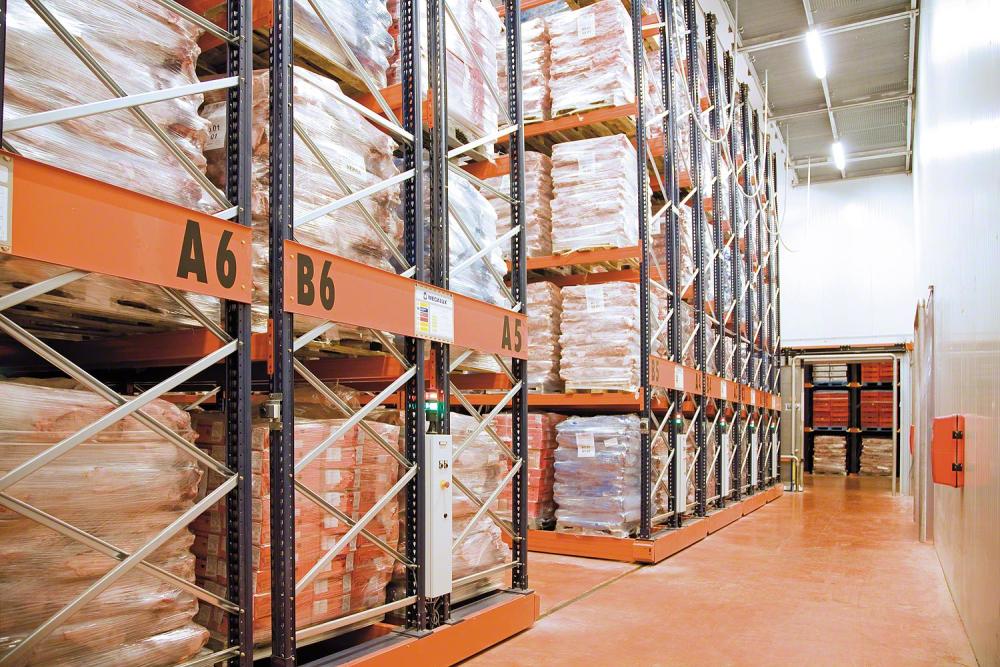 Máximo aprovechamiento del espacio. Sistema óptimo para cámaras frigoríficas o de congelación. Eliminación de pasillos de acceso individuales. Este sistema sobre bases móviles permite que un solo pasillo de trabajo sea válido para acceder a varias estanterías.